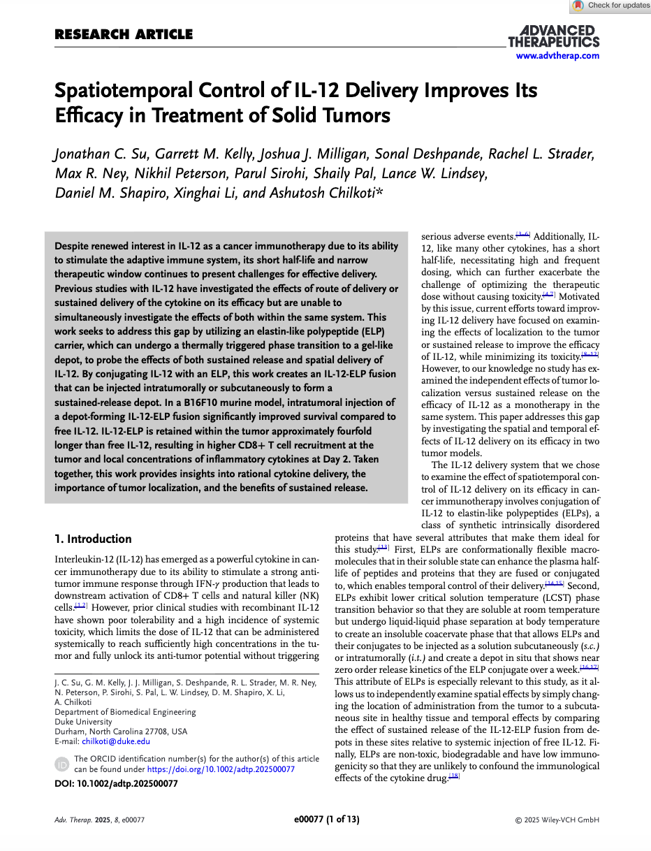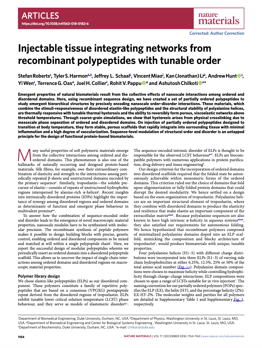 Our research in genetically encoded biomaterials focuses on intrinsically disordered proteins (IDPs). One class – elastin-like polypeptides (ELPs) – are polymers of a Val-Pro-Gly-Xaa-Gly motif found in tropoelastin that display a tunable lower critical solution temperature (LCST) phase behavior. Because of the ELP’s biocompatibility and tunable phase behavior, we have engineered and developed ELPs across several applications. These applications include, but are not limited to: ELP tags for simpler protein purification, self-assembling nanoparticles for anticancer drug delivery, injectable depots for sustained delivery of biologics, partially ordered polypeptide scaffolds for tissue repair, and formation of synthetic biomolecular condensates. Find some recent publications below.